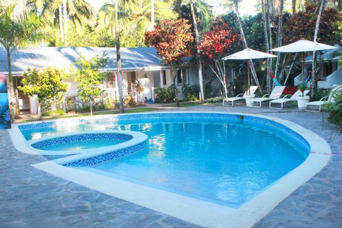 Designed around a central swimming pool, the property features a harmonious collection of accommodations, including five one-bedroom bungalows, five two-bedroom bungalows, three four-bedroom bungalows, and two one-bedroom apartments. The layout creates a sense of privacy while maintaining an inviting communal environment.