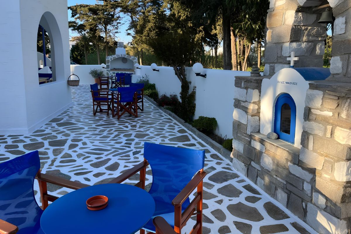 The hotel extends across 300 m² on a 900 m² plot and is arranged over three floors in authentic Cycladic architectural style. Beautiful traditional stone floors, elegant proportions, and inviting outdoor spaces create a warm and timeless atmosphere throughout.