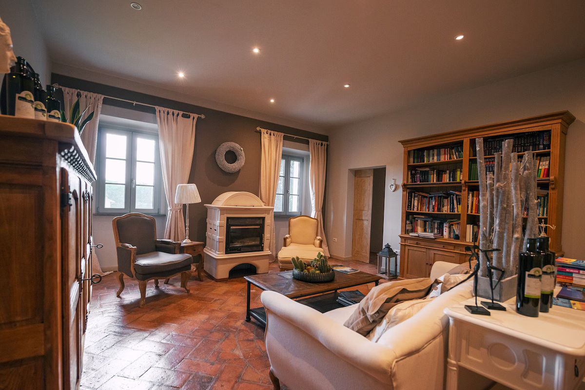 The building has been recently restored with great care to preserve its original charm. The restaurant occupies the former cellars, where exposed brick walls and wooden-beamed ceilings remain visible. The upper floors present a more noble atmosphere, featuring terracotta floors, elegant bathrooms, and decorative details typical of historic countryside villas. Light-coloured plastered and tiled walls enhance the brightness of the interiors, creating a welcoming and luminous environment throughout.